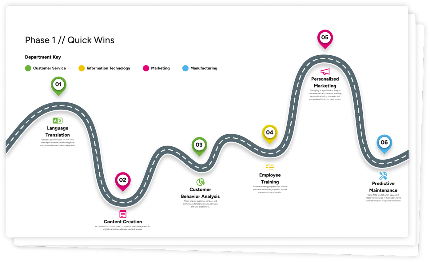 We primarily work with organizations from $10M to $300M. The size and complexity of your organization will determine the timeframe and cost of our engagement. We don't just push a button and send you a bill. Our team carefully engages with your organization following a proven framework to deliver a practical roadmap to maximize time, results, and value in your AI strategy.